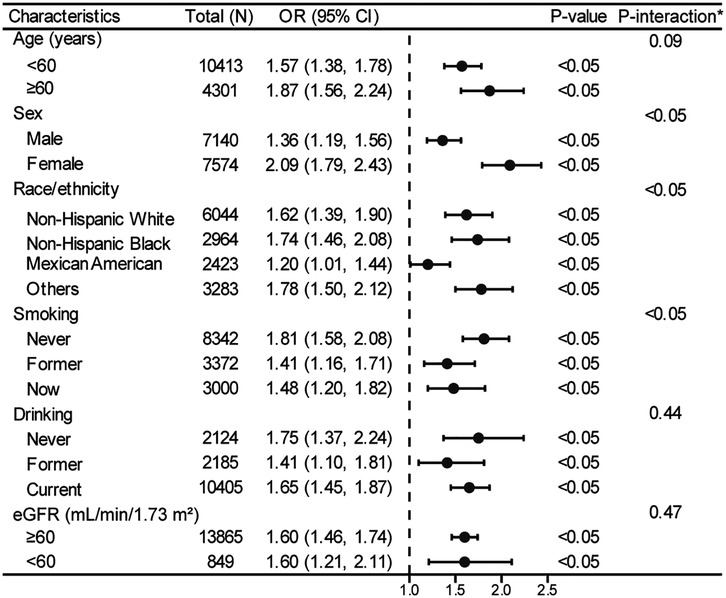 Figure 3. Stratified analyses between TyG index and hyperuricemia in a population with early-stage (stages 0–3) CKM syndrome. *Each stratification adjusted for all the factors (age, sex, race/ethnicity, PIR, educational level, METs/week, smoking, drinking, BMI, eGFR, glucose metabolism state, hypertension, hyperlipidemia, and HEI-2015) except the stratification factor itself. OR, odds ratio; CI, confidence interval; TyG, triglyceride-glucose; CKM, cardiovascular-kidney-metabolic; PIR, poverty income ratio; MET, metabolic equivalent; BMI, body mass index; eGFR, estimated glomerular filtration rate; HEI, healthy eating index.
