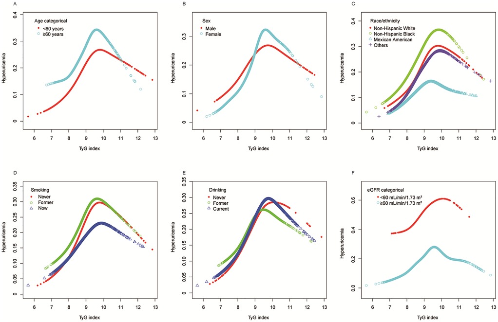 Figure 4. Stratified analyses (by (A) age; (B) sex; (C) race/ethnicity; (D) smoking; (E) drinking; (F) eGFR) between TyG index and hyperuricemia in a population with early-stage (stages 0–3) CKM syndrome using generalized additive model and smooth curve fittings. *Each generalized additive model and smooth curve fitting was adjusted for all factors, including age, sex, race/ethnicity, PIR, educational level, METs/week, smoking, drinking, BMI, eGFR, glucose metabolism state, hypertension, hyperlipidemia, and HEI-2015, except for the stratification factor itself. TyG, triglyceride-glucose; CKM, cardiovascular-kidney-metabolic; PIR, poverty income ratio; MET, metabolic equivalent; BMI, body mass index; eGFR, estimated glomerular filtration rate; HEI, healthy eating index.