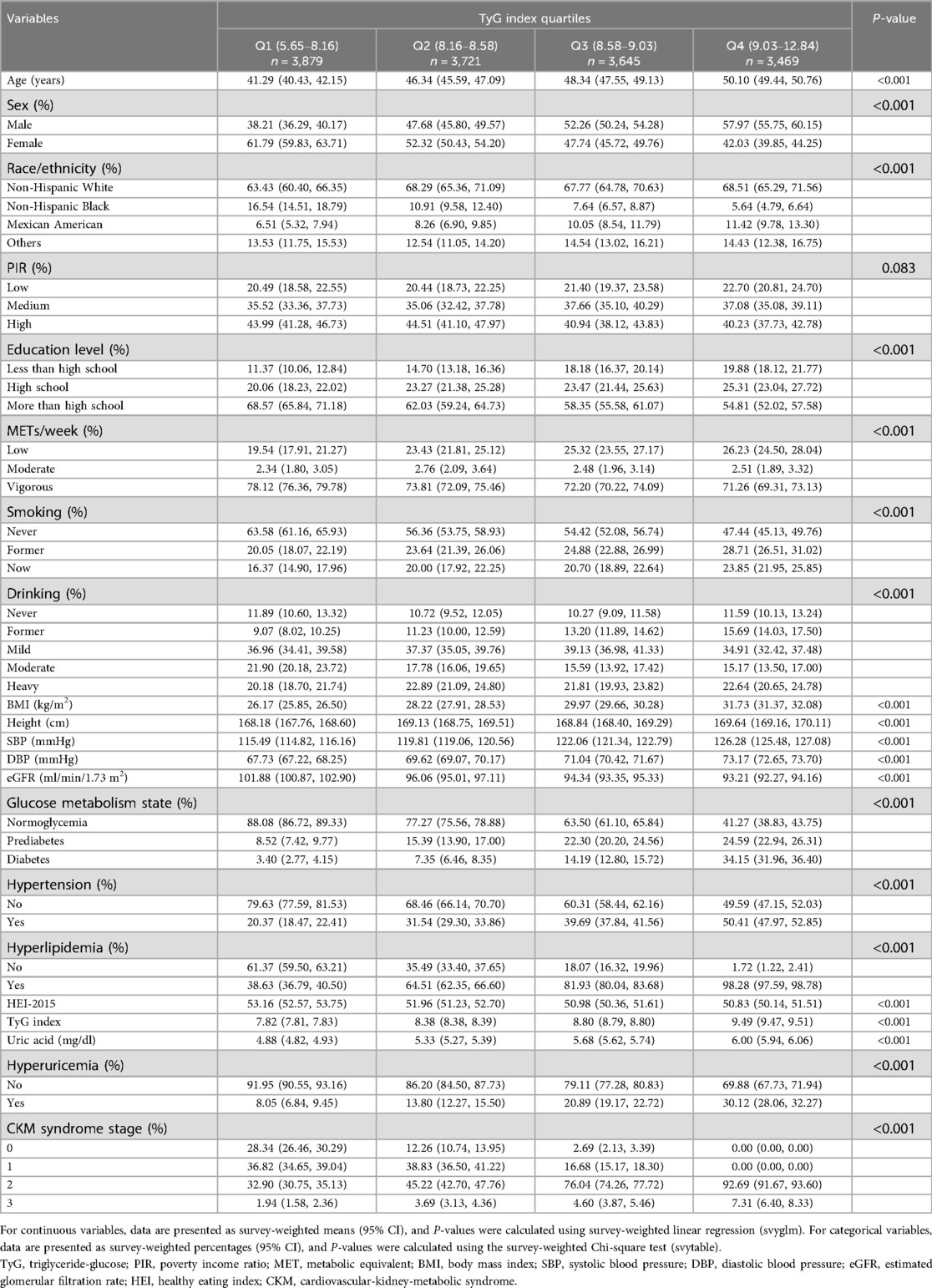 Baseline characteristics of participants across quartiles of the TyG were summarized using descriptive statistical methods. Continuous variables were presented as survey-weighted mean values with 95% confidence intervals, and categorical variables were presented as survey-weighted percentage proportions with 95% confidence intervals. Between-group differences were assessed using survey-weighted linear regression analysis for continuous variables and survey-weighted chi-square statistical tests for categorical variables.