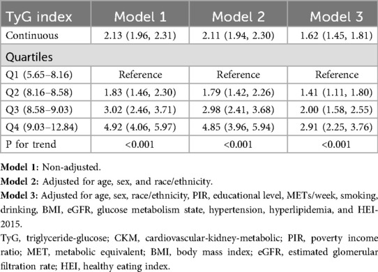 Table 2. Weighted analysis of the association between TyG index and hyperuricemia in a population with early-stage (stages 0–3) CKM syndrome.