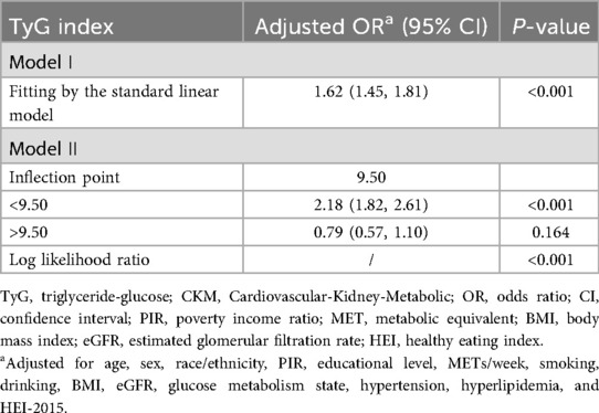 Table 3. Weighted two-piecewise logistic regression analysis of the association between TyG index and hyperuricemia in a population with early-stage (stages 0–3) CKM syndrome.