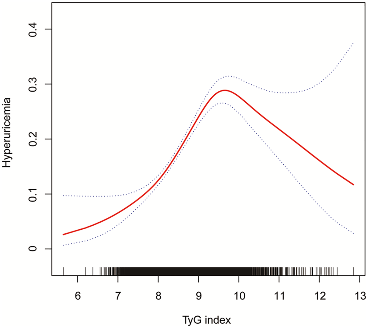 The triglyceride-glucose (TyG) index, a reliable surrogate marker of IR (7), has gained traction in recent years for its predictive value in cardiometabolic disorders (8, 9). Studies have shown that higher TyG index values are associated with an increased risk of type 2 diabetes, hypertension, and cardiovascular diseases (10–12). However, while its utility in assessing cardiometabolic risk has been established, limited research has explored the relationship between the TyG index and hyperuricemia, particularly in populations with CKM syndrome. Investigating this relationship could offer valuable insights into the role of IR in CKM-related metabolic disturbances and inform early intervention strategies.
