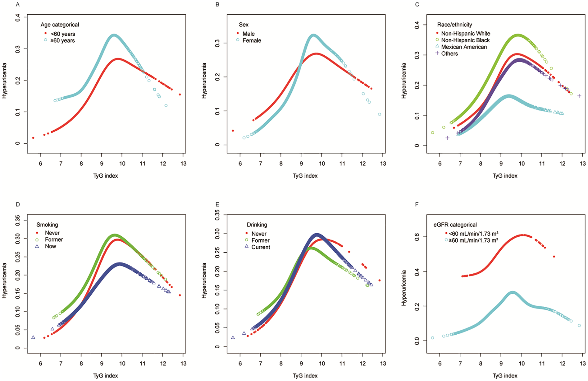 The association between the TyG index and hyperuricemia was examined using a three-step analytical approach. First, survey-weighted logistic regression models were constructed to evaluate the relationship. Three models were developed: Model 1, unadjusted; Model 2, adjusted for age, sex, and race/ethnicity; and Model 3, adjusted for a comprehensive set of covariates including age, sex, race/ethnicity, PIR, educational level, physical activity (METs/week), smoking status, drinking status, BMI, eGFR, glucose metabolism state, hypertension, hyperlipidemia, and HEI-2015. Second, generalized additive models and smooth curve fitting were employed to explore potential non-linear relationships between the TyG index and hyperuricemia. When non-linearity was identified, a recursive algorithm was used to calculate the inflection point, followed by the construction of survey-weighted piecewise logistic regression models for the segments on either side of the inflection point. The log-likelihood ratio test was applied to compare the standard logistic regression model with the piecewise model to determine the better fit. Finally, subgroup analyses were performed using survey-weighted stratified logistic regression models, stratified by variables such as age, sex, race, smoking status, alcohol consumption and eGFR. Continuous stratification variables were categorized based on clinically relevant cut-points before conducting interaction tests. Effect modification was assessed using likelihood ratio tests to evaluate interactions between variables and the TyG index.