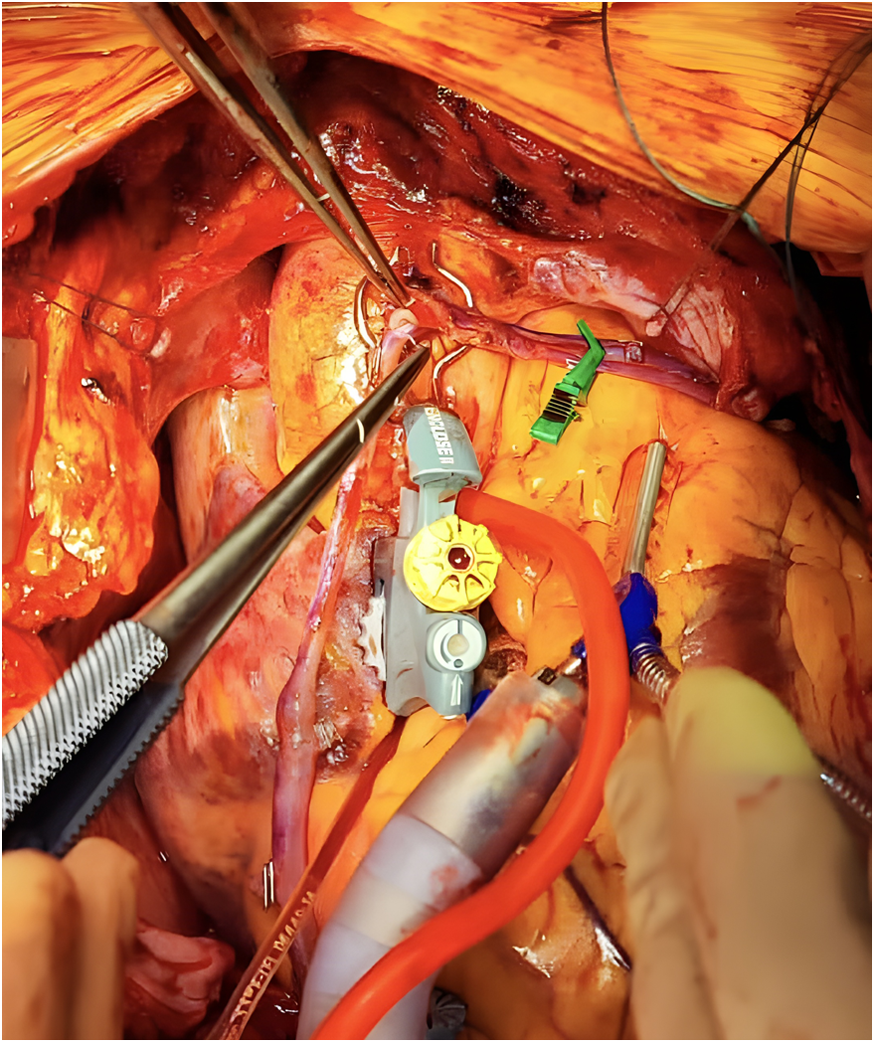 After creating a single hole in the ascending aorta with one of the aforementioned devices, a segment of the saphenous vein graft (SVG) is first anastomosed to the aorta in the usual fashion using a 6.0 polypropylene suture. Following our institutional culture of safety, the first proximal anastomosis—the foundation of the piggyback configuration—is consistently secured using a CorKnot®Micro (LSI Solution) (14). This approach facilitates subsequent identification and selective catheterization of the aortocoronary grafts by interventional cardiologists, thereby ensuring optimal visualization when required.