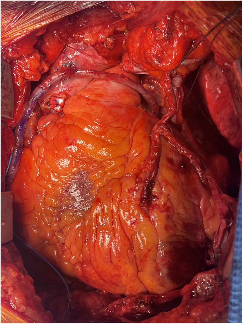 Instead of punching a second hole in the aorta, the hood of the SVG, directly over the aortotomy, is longitudinally incised with a scalpel to create an orifice. A second graft, either another SVG or an arterial conduit, is then anastomosed to the hood of the first anastomosis using a 7.0 or 8.0 polypropylene suture, completing the piggyback configuration (Figure 2).