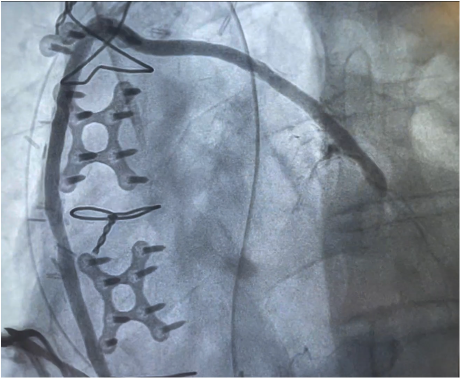Two (1.8%) patients required ventilation longer than 24 h. Importantly, no strokes or myocardial infarctions occurred, and only one (0.9%) patient needed surgical re-exploration for bleeding. The mean length of hospital stay was 5.5 [4.0–8.0] days. At 30 days, no patient died or required repeat revascularization. Cardiac readmission occurred in 3 (2.7%) patients, Table 3. Patients who underwent postoperative angiography demonstrated no evidence of thrombosis, occlusion, kinking, or torsion of the piggyback anastomoses (Figure 3). Furthermore, the feasibility of angiographic assessment of the piggyback technique was confirmed, as interventional cardiologists experienced no difficulties in identifying or injecting the piggyback proximal anastomosis during the procedure. At a mean follow-up of 1.0 [0.5–1.7] years, there were no cardiac-related deaths, with an overall survival of 98.2% (110/112). Only one myocardial infarction occurred (0.9%), and four strokes (3.6%) were reported. In this regard, one stroke occurred in a patient with a known arteriovenous malformation that eventually ruptured, and one confirmed after a subsequent percutaneous coronary intervention, thus not directly related to the CABG surgery or anastomotic technique. Repeat Piggyback revascularization rate was 3.6% (4/112) at a mean of 2.0 ± 0.5 years. Among the revascularized grafts, three were veins and one was an artery. As far as the piggyback configuration of these patients who underwent percutaneous interventions, revascularization was performed on two grafts attached directly to the aorta and two grafts placed on top of the first graft, thus showing that repeat revascularization is independent of the piggyback configuration, Table 4.