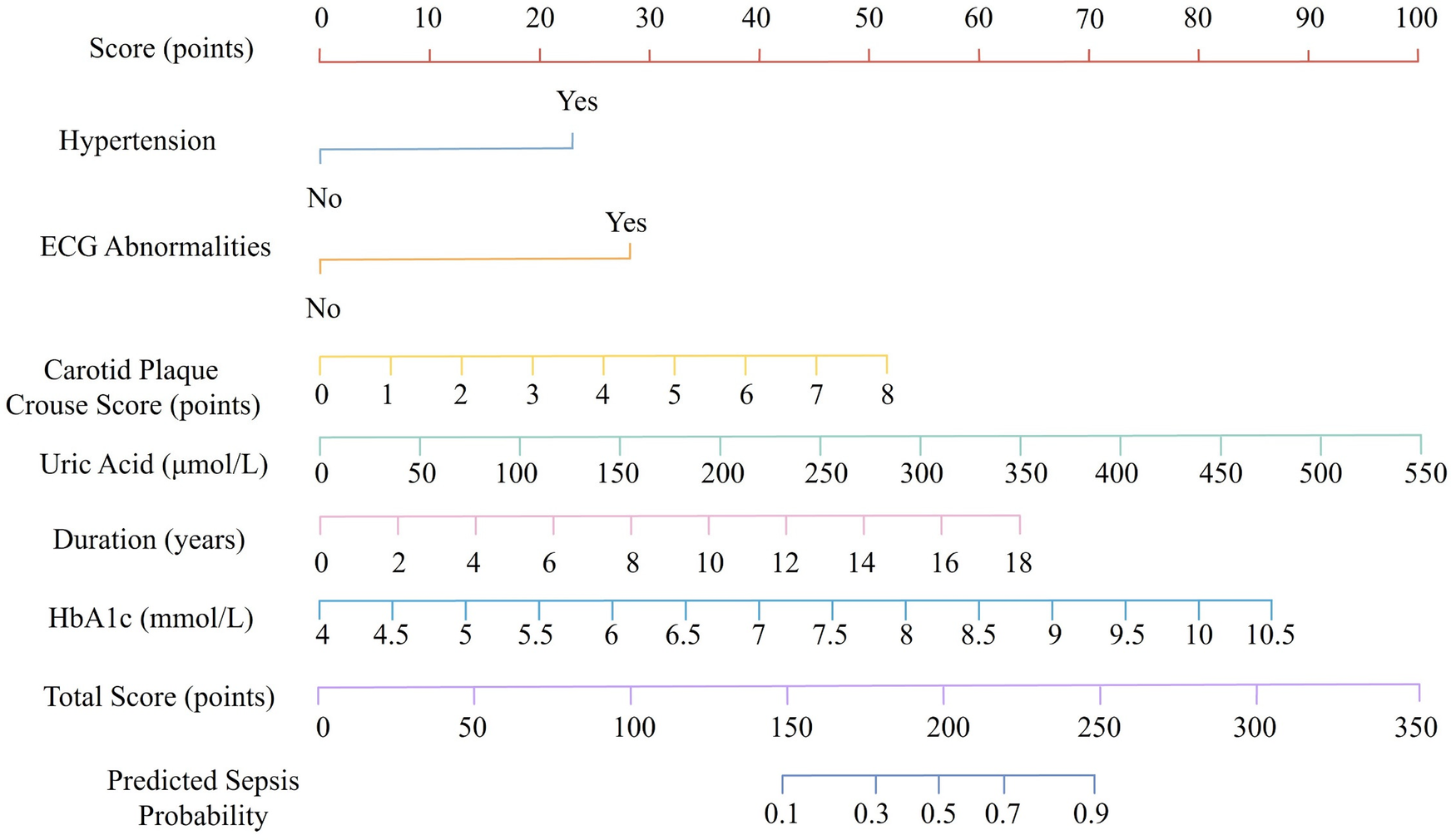 Based on the results of the multivariate logistic regression analysis, six independent risk factors were identified as significant contributors to the development of CHD in RA patients: hypertension, HbA1c, RA duration, carotid plaque Crouse score, uric acid, and ECG abnormalities. These variables were incorporated into a nomogram prediction model to estimate the probability of CHD occurrence in RA patients. In the nomogram, each predictive variable was assigned a corresponding score based on its relative contribution to CHD risk. The individual scores for all variables were summed to calculate a total score. This total score was then mapped to a probability scale at the bottom of the nomogram, providing an individualized prediction of CHD risk. The higher the total score, the greater the probability of CHD occurrence (Figure 1). This nomogram provides a practical and visual tool for clinicians to assess CHD risk in RA patients by integrating both traditional cardiovascular risk factors and disease-specific variables.