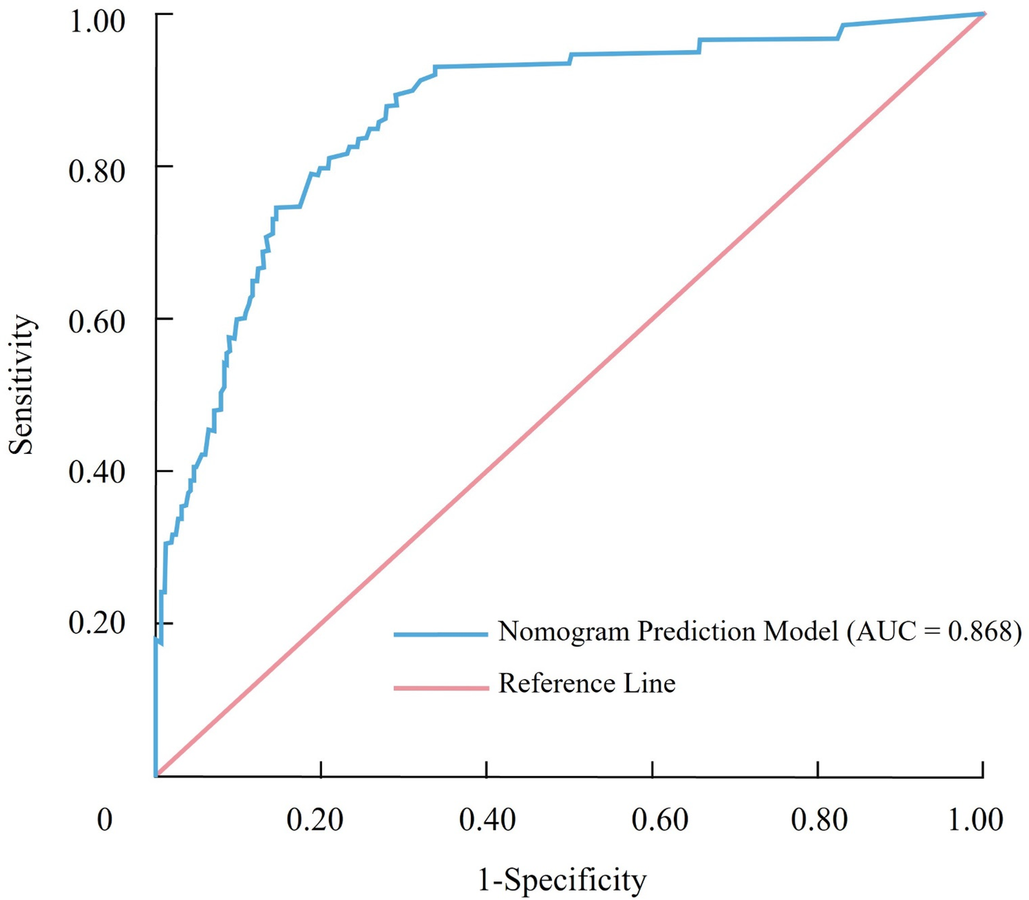 The discriminative performance of the nomogram prediction model for CHD in RA patients was evaluated using the AUC. The model demonstrated an AUC of 0.868 (95% CI: 0.819–0.916), indicating excellent discriminatory ability. At the optimal cutoff point, determined by the maximum Youden index, the model achieved a sensitivity of 81.2% and a specificity of 83.8%, underscoring its effectiveness in correctly identifying patients at risk for CHD. To ensure the robustness of the model, internal validation was performed using the bootstrap resampling method. Following resampling, the model maintained a high AUC of 0.866 (95% CI: 0.815–0.908), further confirming its reliability and stability. These findings highlight the nomogram's strong discriminative ability, making it a valuable tool for clinical risk stratification of CHD in RA patients (Figure 2).