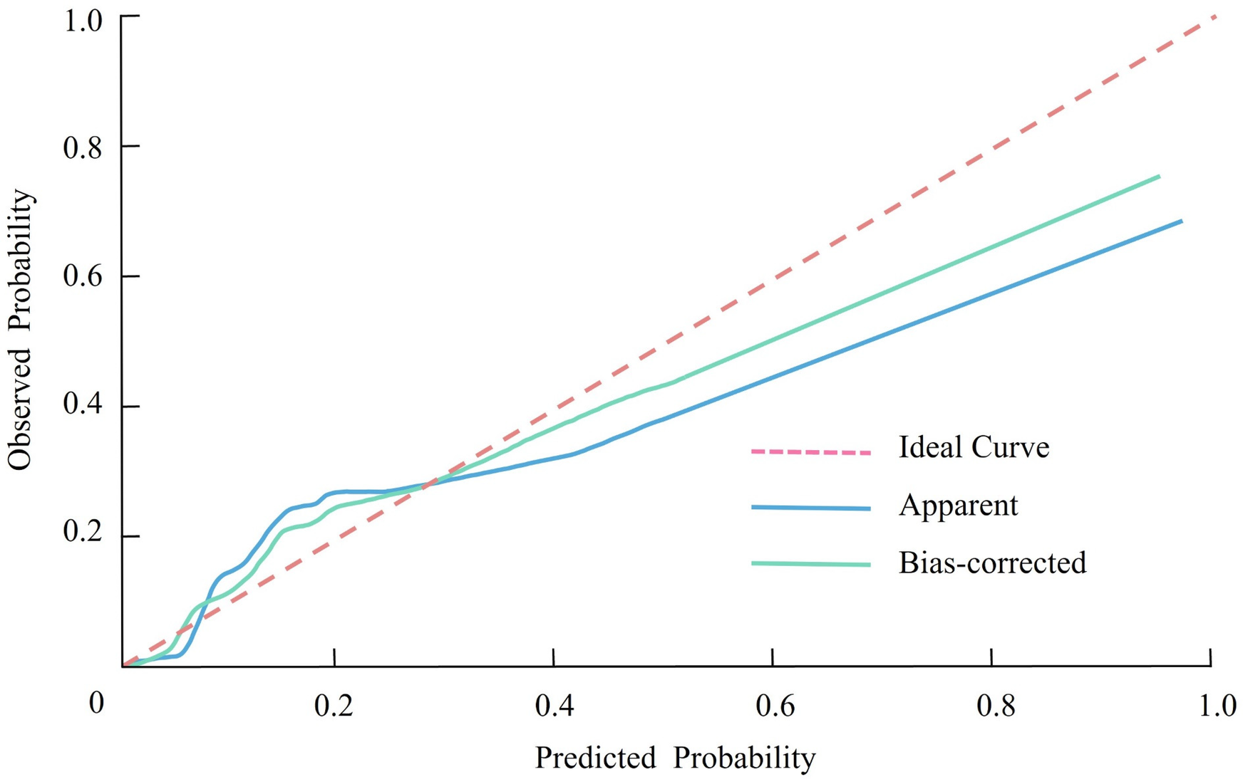 The calibration of the nomogram prediction model was assessed using the Hosmer-Lemeshow goodness-of-fit test. The results demonstrated a χ² value of 3.188 and a P-value of 0.908, indicating that the model's predicted probabilities were well-aligned with the observed outcomes. This suggests that the model has a high degree of calibration and is reliable in estimating the likelihood of CHD occurrence in RA patients. Further confirmation of the model's calibration was provided by the calibration curve (Figure 3). The curve showed that the predicted probabilities closely matched the actual probabilities across different risk levels, demonstrating strong consistency between the predicted and observed outcomes.
