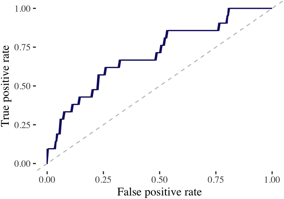 Performance of machine learning model on test dataset. This figure demonstrates the receiving operating characteristic curve for the extreme gradient boosting model to predict MACE in the test dataset utilizing the discovery cohort. The area under the curve (AUC) assesses the model’s accuracy. AUC, 0.71.