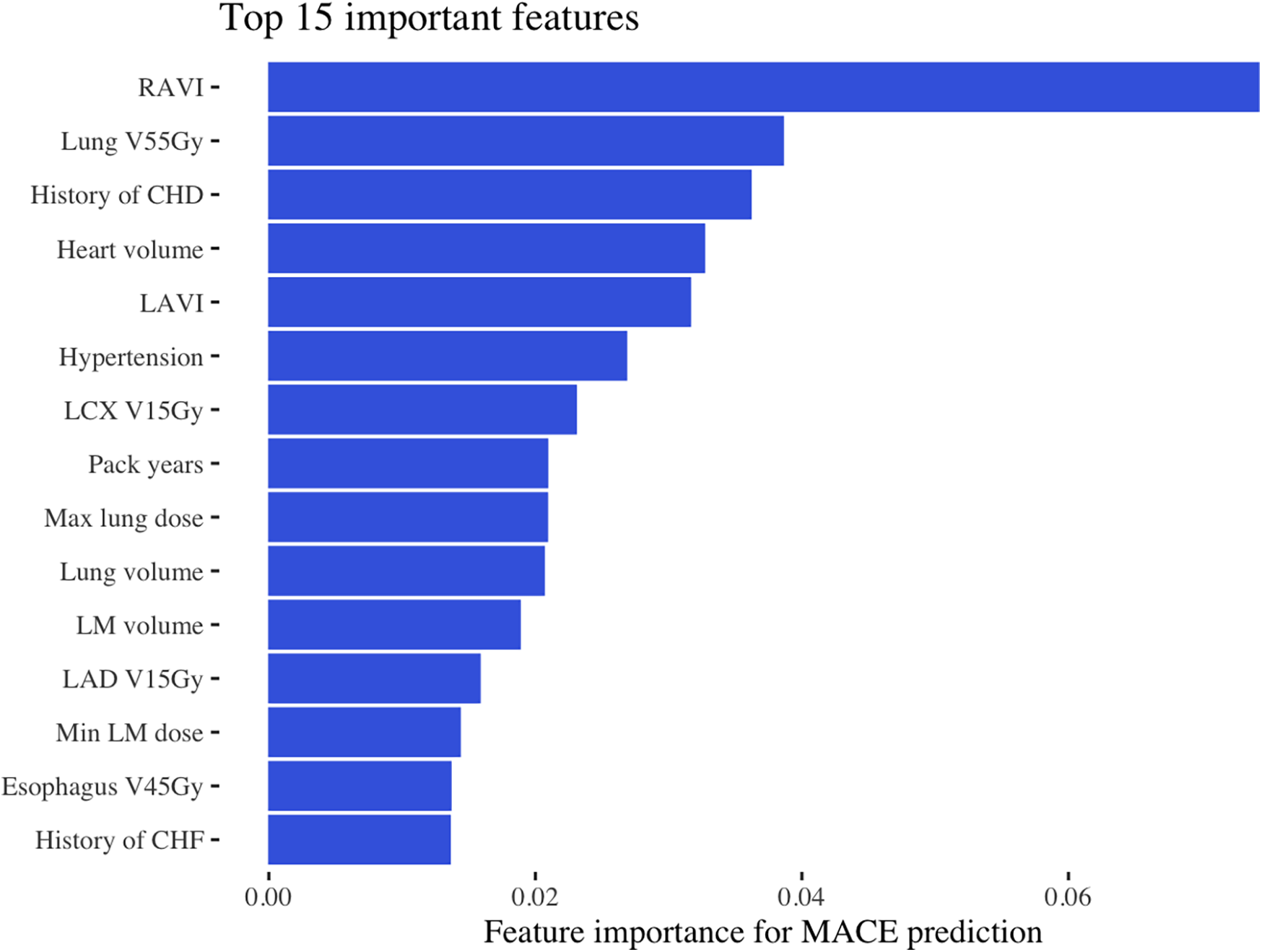 Most important features for MACE prediction. This figure shows the top 15 most important features identified by the machine learning model in the discovery dataset, ranked by total gain. RAVI, right atrial volume index; Gy, Gray; V55Gy, volume receiving 55 Gray; CHD, coronary heart disease LAVI, left atrial volume index; LCx, left circumflex artery; V15Gy, volume receiving 15 Gray; Dmin, dose minimum; V45Gy, volume receiving 45 Gray; CHF, congestive heart failure.