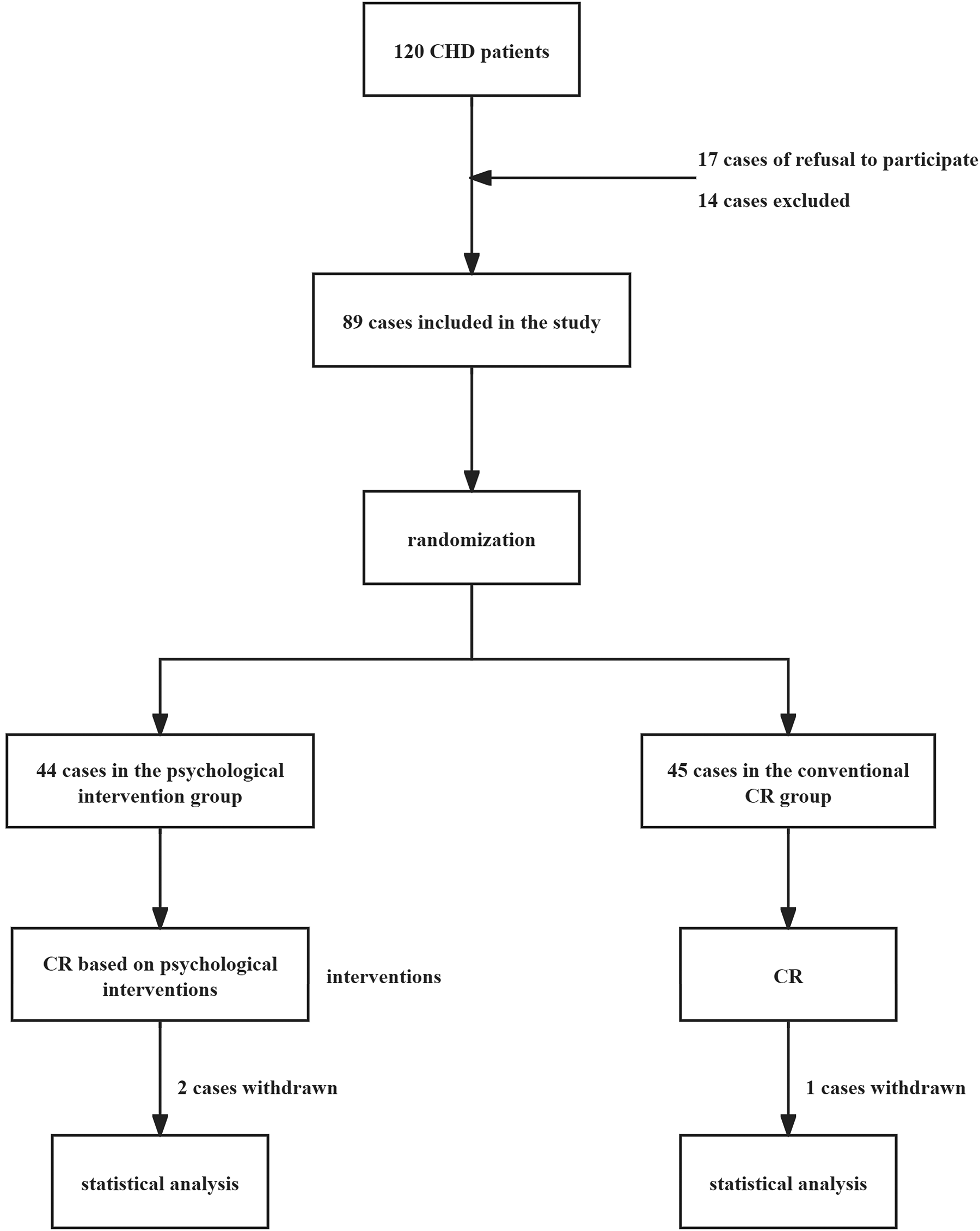 This investigation encompassed a cohort of 120 individuals diagnosed with coronary heart disease (CHD), who sought medical attention at Bethune International Peace Hospital between June 2022 and June 2023. Among these, 17 patients (14.17%) declined participation, while 14 patients (11.67%) were excluded based on predefined criteria. Consequently, 89 participants were enrolled and randomly allocated into two distinct groups: 44 individuals were assigned to the psychological intervention cohort, and 45 to the conventional cardiac rehabilitation (CR) cohort. During the course of the intervention, 2 participants from the psychological intervention group and 1 from the conventional CR group withdrew from the study. Ultimately, 86 patients successfully completed the trial, comprising 42 in the psychological intervention group and 44 in the conventional CR group. Comparative analysis revealed no statistically significant disparities in baseline characteristics, including gender, age, duration of illness, cardiac functional classification, number of affected vessels, or comorbid conditions, between the two groups (P > 0.05). (Table 1, Figure 1)