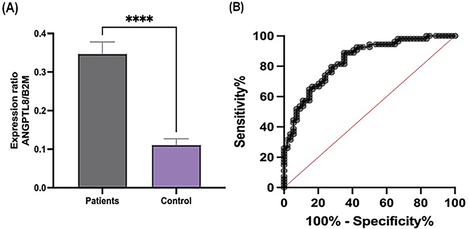 Expression levels and diagnostic performance of ANGPTL8 in patients and controls. (A) The expression ratio of ANGPTL8 to B2M was significantly higher in patients than in the controls. Data are presented as the mean ± SEM. ****indicates p < 0.0001. (B) ROC curve analysis of ANGPTL8 expression highlights its diagnostic potential. The curve demonstrated high sensitivity and specificity, supporting ANGPTL8 as a potential biomarker for distinguishing patients from controls.