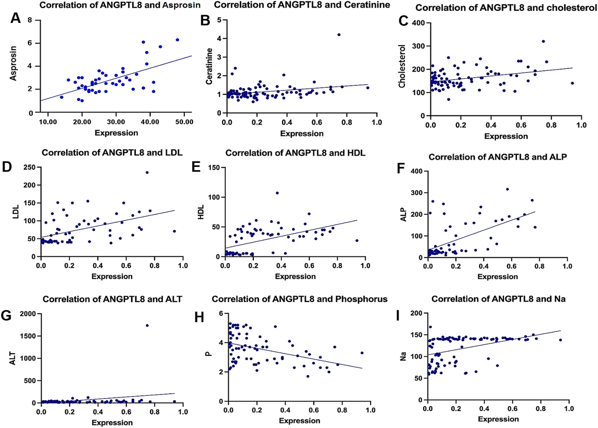 Correlation between ANGPTL8 expression and various clinical parameters. Scatter plots showing the correlation of ANGPTL8 levels with (A) asprosin, (B) creatinine, (C) cholesterol, (D) LDL, (E) HDL, (F) ALP, (G) ALT, (H) phosphorus, and (I) sodium levels. There were significant positive correlations between ANGPTL8 and asprosin (r = 0.795, p < 0.0001), HDL (r = 0.609, p < 0.0001), and ALP (r = 0.5857, p = 0.0001), as shown in the figure using various symbols. These findings suggest possible connections between ANGPTL8 expression and metabolic-inflammatory pathways in ACS.