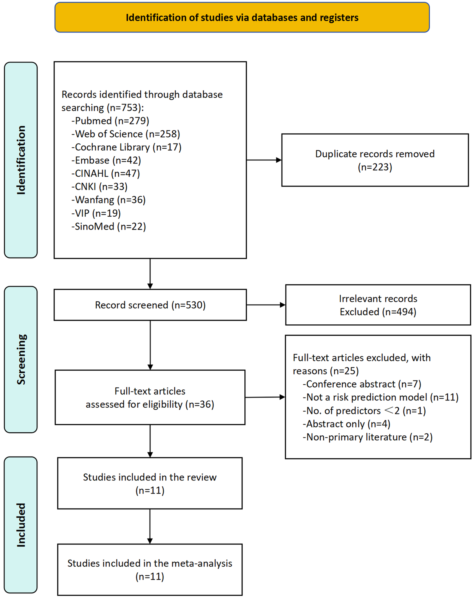 Flowchart depicting a systematic review process. A total of 753 records were identified through database searching. After removing 223 duplicates, 530 records remained for screening. Following screening, 494 records were excluded as irrelevant, and 36 full-text articles were assessed for eligibility. After excluding 25 additional articles (due to reasons such as conference abstracts, non-risk prediction models, fewer than 2 predictors, abstract-only publications, and non-primary literature), 11 studies were ultimately included.