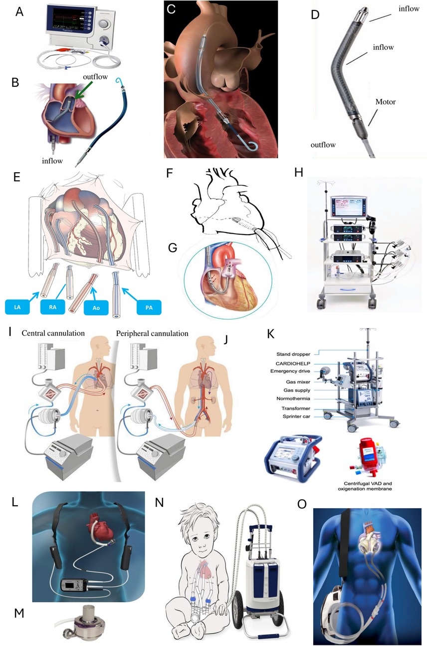 Figure 1. Examples of mechanical circulatory support (MCS) devices and configurations. Upper panel: Impella devices (Abiomed, Johnson & Johnson®, Massachusetts, USA) (A) Impella console, (B) Impella RP, (C) Impella CP, and (D) Impella 5.5. Middle upper panel: (E) Cannulation of the great vessels with Centrimag (Abbott®, Illinois, USA), (F) Cannulation of the left ventricle with Centrimag, (G) ProtekDuo (LivaNova®, London, UK), and (H) Centrimag console. Middle lower panel: (I) VA-ECMO with central cannulation, (J) VA-ECMO with peripheral cannulation, and (K) ECMO console and oxygenator. Lower panel: Durable mechanical circulatory support devices (L) Overview of the left ventricular assist device (LVAD) system, HeartMate 3 (Abbott®, Illinois, USA), (M) HeartMate 3 LVAD cannula, (N) Berlin Heart EXCOR® (Berlin Heart GmbH, Berlin Germany), and (O) Total Artificial Heart (SynCardia®, Tucson, USA). Ao, aorta; LA, left atrium; PA, pulmonary artery; RA, right atrium. Images provided by: A–D: Johnson and Johnson; E, F, H, L, M: Abbott; G: Palex; I, J: Hospital Universitari de Bellvitge; K: Gettinge; N: BerlinHeart; O: Mercé.