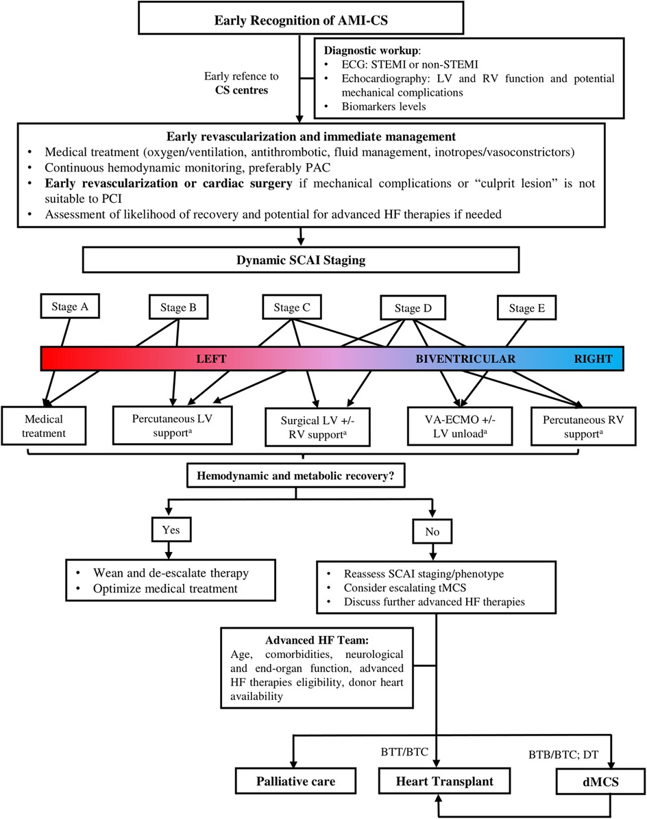 Figure 2. Algorithm for management of patients with cardiogenic shock related to acute myocardial infarction (AMI-CS). Legend: a. Device selection depends on availability and institutional expertise. AMI-CS, acute myocardial infarction related cardiogenic shock; BTB, bridge to bridge; BTC, bridge to candidacy; BTT, bridge to transplant; CS, cardiogenic shock; dMSC, durable mechanical circulatory support; DT, destiny therapy; HF, heart failure; IABP, intra-aortic balloon pump; LV, left ventricle; PAC, pulmonary artery catheter; RV, right ventricle; SCAI, Society for Cardiovascular Angiography and Interventions; STEMI, ST elevation myocardial infarction, tMSC, temporary mechanical circulatory support; VA-ECMO, arterial-venous extracorporeal membrane oxygenation.