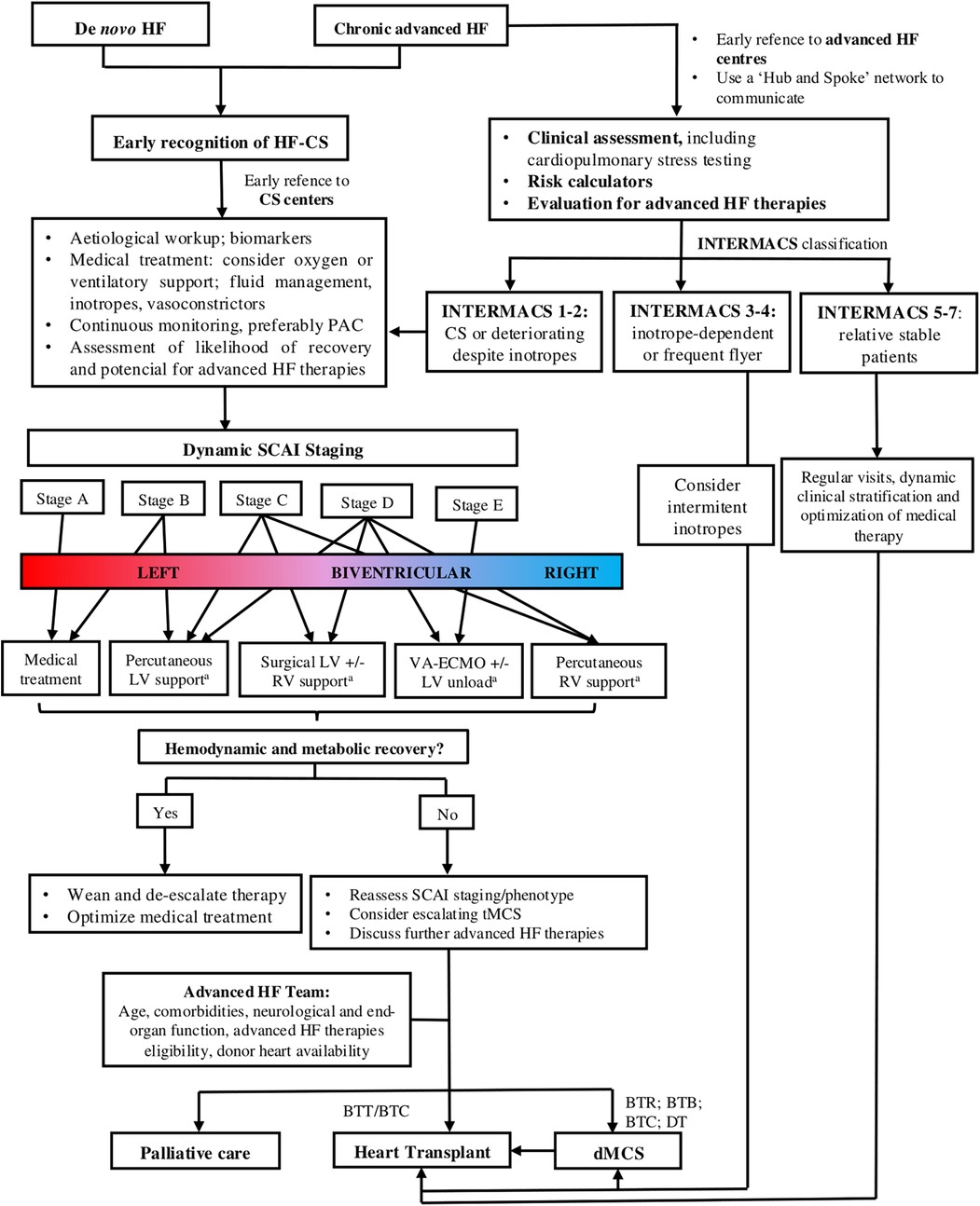 Figure 3. Algorithm for management of patients with advanced heart failure and cardiogenic shock related to HF (HF-CS). Legend: a. Device selection depends on availability and institutional expertise. BTB, bridge to bridge; BTC, bridge to candidacy; BTR, bridge to recovery; BTT, bridge to transplant; CS, cardiogenic shock; dMSC, durable mechanical circulatory support; DT, destiny therapy; HF, heart failure; HF-CS, heart failure related cardiogenic shock; INTERMACS, Interagency Registry for Mechanically Assisted Circulatory Support; LV, left ventricle; PAC, pulmonary artery catheter; RV, right ventricle; SCAI, Society for Cardiovascular Angiography and Interventions; tMCS, temporary mechanical circulatory support.
