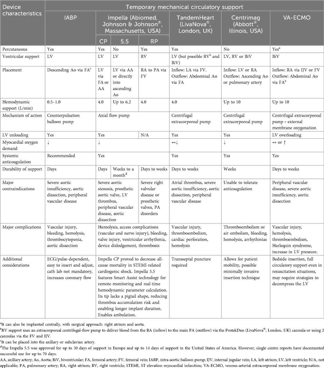 Table 1. Types and main characteristics of temporary mechanical circulatory support (3, 4, 8, 38, 54, 131, 150, 151).