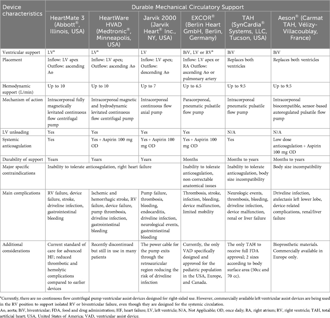 Table 2. Types and main characteristics of durable mechanical circulatory support (8, 38, 54, 131, 150, 151).
