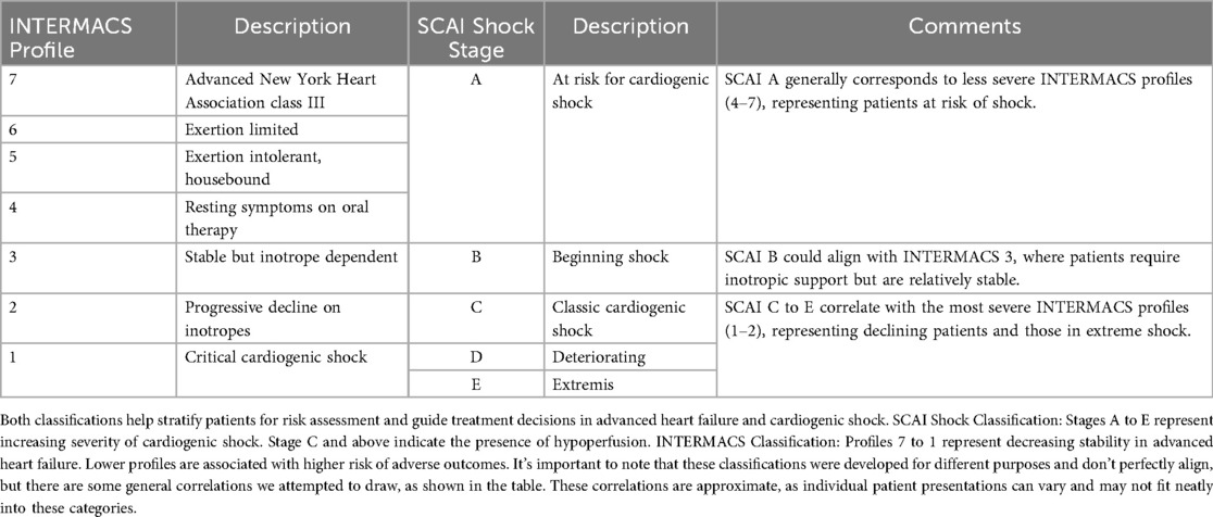 Table 3. Representation of interagency registry for mechanically assisted circulatory support (INTERMACS) and society for cardiovascular angiography and interventions (SCAI) classifications.