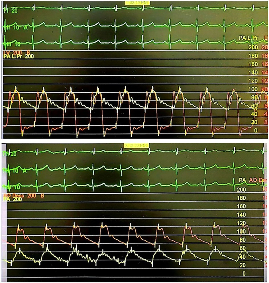 We decided to re-perform right heart catheterization to measure the patient's hemodynamic profile and proceed with device PDA closure if the measurements were satisfactory. Prior to the procedure, the patient had received a detailed explanation of the risks, benefits, and rationale for the planned intervention, and she agreed to proceed with the management plan. TTE/TEE examination before the catheterization revealed a type A PDA with a bidirectional shunt, isthmus 8–9 mm, ampulla 14 mm, short diastolic flow, pressure gradient 22 mmHg, mild mitral regurgitation, and mild tricuspid regurgitation. The PDA was considered suitable for device closure. Right heart catheterization was done with both anterograde and retrograde approaches, and the hemodynamic measurements obtained were as follows: mPAP: 79; mAoP: 85; Qp:Qs: 1.25; PVR: 16.38 WU; PVRi: 27.68 WU m2; PVR/SVR: 0.68 (Figure 1). Saturation measurements were as follows: LPA: 73%; LV: 94%; AoD: 95%. This measurement showed a slight improvement in pressure and vascular resistance compared to the previous catheterization, but the patient was still classified as having severe PH. We proceeded with an acute vasoreactivity test using FiO2 100% for 10 min, and the results were as follows: Qp:Qs: 8.21; PVR: 1.74 WU; PVRi: 2.94 WU m2; PVR/SVR: 0.10. Saturation measurements were as follows: LPA: 96%; LV: 96%; AoD: 97%. From this measurement, we confirmed the diagnosis of PH with low flow and high resistance, but this time the patient was reactive to the vasoreactivity test. Therefore, the decision was made to close the PDA using a MemoPart PDA Occluder No. 20/22 mm through an antegrade transvenous approach with TEE & minimal fluoroscopy guidance. The patient was then observed for 10 min to assess response to shunt occlusion and anticipate for complications due to the PH. Continuous monitoring included vital signs, PA pressure, AoD pressure, and electrocardiography (ECG). During this observation period, no significant changes occured. TTE evaluation showed appropriate device position, residual central mild shunt (+), and no obstruction in the LPA and AoD. It was decided to release the device. Post-procedure AoD pressure measurement was 122/78 (96), mPA pressure measurement was 66/34 (49) mmHg. The patient's clinical status was stable following the procedure. She recovered well and reported significant improvement in symptoms immediately after the procedure. She was discharged with a continued prescription for sildenafil.