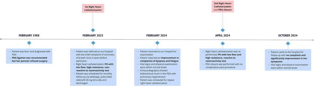 One month and 6 months after the procedure, she came to the clinic for a follow-up with no complaint. She was able to participate in moderately intensive activities without any discomfort. Her room oxygen saturation is 95% and other vital signs are normal. Figure 2 illustrates the timeline of this patient's case.
