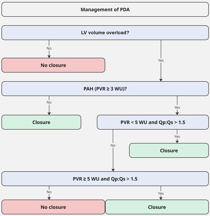 Figure 3. Management of PDA (adapted from 2020 ESC guideline for grown-up congenital heart disease) (1). LV, left ventricle; Qp:Qs, pulmonary to systemic flow ratio; PAH, pulmonary artery hypertension; PDA, patent ductus arteriosus; PVR, pulmonary vascular resistance; WU, Wood units.