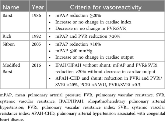 Another indicator in cardiac catheterization that has been considered to assess suitability for defect closure in patients with PH-CHD is acute vasoreactivity testing (AVT). AVT is used to distinguish between reversible and progressive PAH, and thus potential operability. The definition of a positive AVT remains a controversy. Several criteria that have been used to assess response to AVT are listed in Table 1. The Barst criteria are often used for pediatric patients, while the Sitbon criteria are currently recommended for adult patients (4). In 2016, the European Paediatric Pulmonary Vascular Disease (PVD) Network proposed a modified Barst criteria, which separates the definition of a positive AVT result depending on whether prognosis or PH therapy is assessed, or operability (5). However, these hemodynamic cutoffs have not been proven sufficiently accurate to predict reversal post-shunt correction (6, 7). At our center, we use an institution-specific adaptation of vasoreactivity criteria that considers multiple hemodynamic parameters to guide clinical decision-making, particularly in patients with CHD-associated PH. Our assessment also refers to the ESC/ERS Guidelines for the diagnosis and treatment of pulmonary hypertension, which outline thresholds used to assess feasibility of shunt closure. Specifically, we define a positive AVT response as meeting the following criteria: