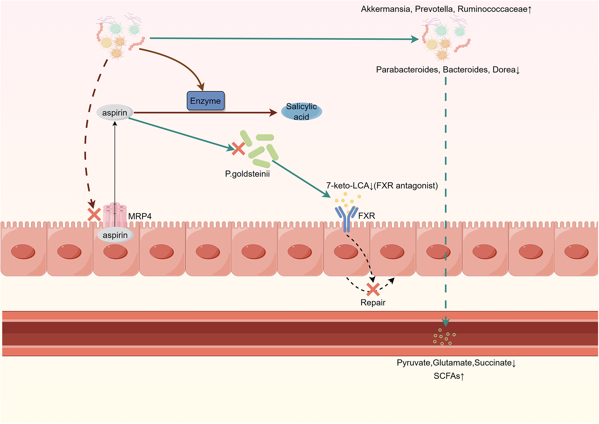 Interaction between gut microbiota and aspirin.Gut microbiota inhibits MRP4 expression, reducing the efflux of aspirin from intestinal cells. Aspirin inhibits P. goldsteinii, leading to decreased production of 7-keto-LCA. This weakens its inhibitory effect on FXR, thereby impairing the self-repair ability of intestinal cells. Aspirin increases the abundance of anti-inflammatory bacteria while reducing the levels of pro-inflammatory bacteria in the gut. Gut microbiota metabolic enzymes convert aspirin into salicylic acid, which is less readily absorbed compared to aspirin. MRP4, multidrug resistance protein 4; P. goldsteinii, Parabacteroides goldsteinii; 7-keto-LCA, 7-keto-lithocholic acid; FXR, farnesoid X receptor.