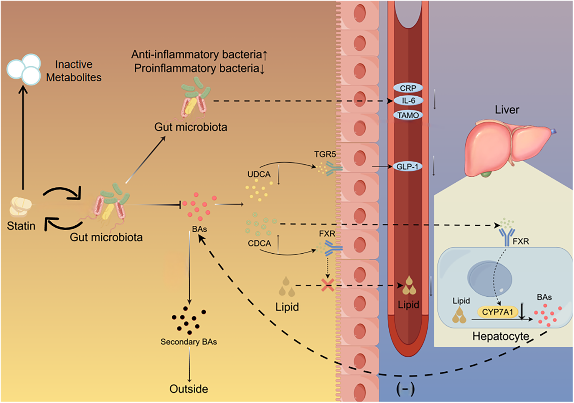 Interaction between gut microbiota and statin. Statins reduce the proportion of pro-inflammatory bacteria in the gut while increasing the proportion of anti-inflammatory bacteria. Statins decrease the proportion of UDCA which binds to the TGR5 on intestinal cells to stimulate the secretion of GLP-1. Statins increase the proportion of CDCA which binds to the FXR in the intestine to inhibit lipid absorption and the FXR in the liver to suppress the expression of Cyp7A1.The gut microbiota metabolizes statins, leading to a decrease in their bioavailability. UDCA, ursodeoxycholic acid; CDCA, chenodeoxycholic acid; TGR5, takeda G protein-coupled receptor 5; FXR, farnesoid X receptor; CyP7A1, cholesterol 7α-Hydroxylase; Bas, bile acids.