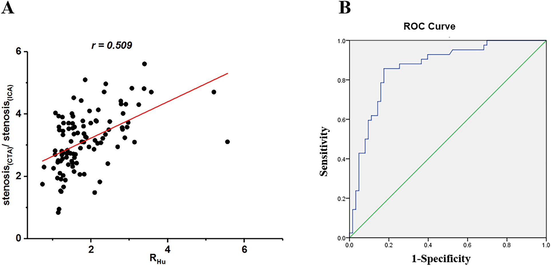 Scatterplots of relationship between ratio of stenosis assessed by coronary CTA versus ICA and Hu values between calcified plaque and blood (RHu) (A) ROC curve analysis was obtained to predictive value of RHu for coronary CTA to detect stenosis degree and determine the cutoff of ratio of RHu(B) CTA, computed tomography angiography; ICA, invasive coronary angiography; ROC, receiver operating characteristic; Hu, hounsfield units; RHu, ratio of HU values between calcified plaque and blood.