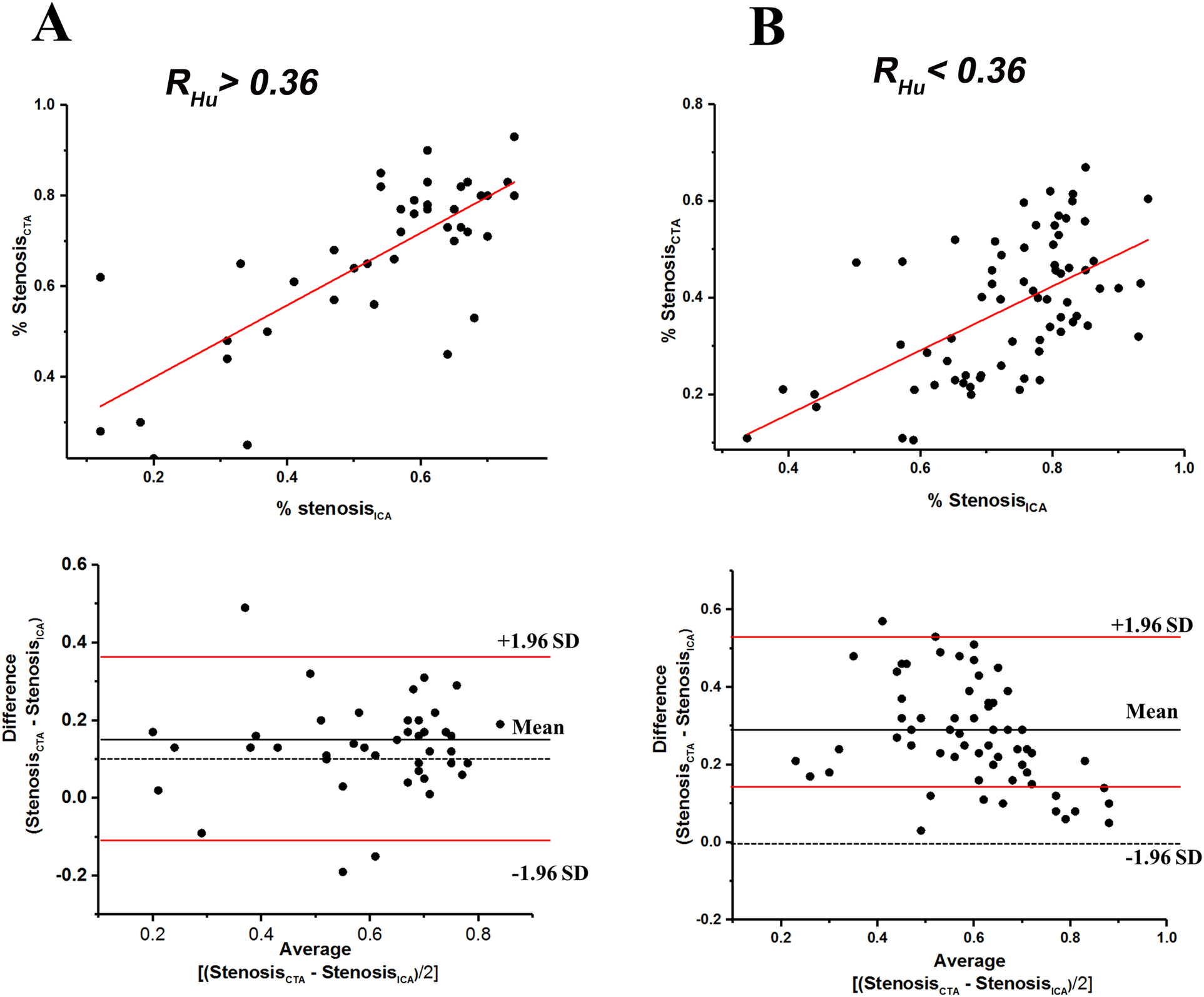 Scatterplots of relationship between stenosis degree (%) measured with coronary CTA and ICA, and bland-altman plots of relative (%) difference between stenosis degree (%) as assessed by coronary CTA versus ICA (reference) within RHu > 0.36 (A), and RHu < 0.36 (B) within the scatterplots the red lines represent fitted regression lines at scatterplots and represent 95% confidence intervals at bland-altman plots. CTA, computed tomography angiography; ICA, invasive coronary angiography; Hu, Hounsfield units; RHu, ratio of HU values between calcified plaque and blood; SD, standard deviation.