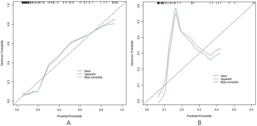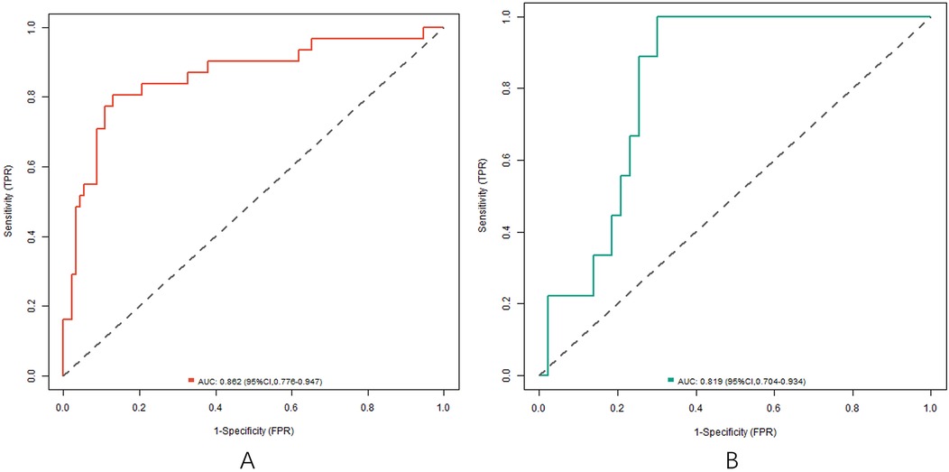 In the training and testing sets, the AUCs were 0.862 (95% CI: 0.776–0.947) and 0.819 (95% CI: 0.704–0.934), respectively, indicating excellent discrimination for the nomogram model predicting poor clinical efficacy. The sensitivity was 0.806 (95% CI: 0.712–0.900) and 0.750 (95% CI: 0.621–0.879), and the specificity was 0.870 (95% CI: 0.801–0.939) and 0.791 (95% CI: 0.676–0.906) for the training and testing sets, respectively. The calibration curve, assessed using bootstrapping (1,000 resamples), showed the mean absolute errors of predicted and actual values were 0.118 (95% CI: 0.092–0.144) and 0.139 (95% CI: 0.110–0.168), respectively. The Hosmer-Lemeshow test results were χ2 = 8.3042, P = 0.4043 (training set) and χ2 = 10.777, P = 0.2147 (testing set), demonstrating good model fit. Recalibration adjustments were applied to further optimize the model's performance. The calibration curves are shown in Figure 3 and the ROC curves are shown in Figure 4.