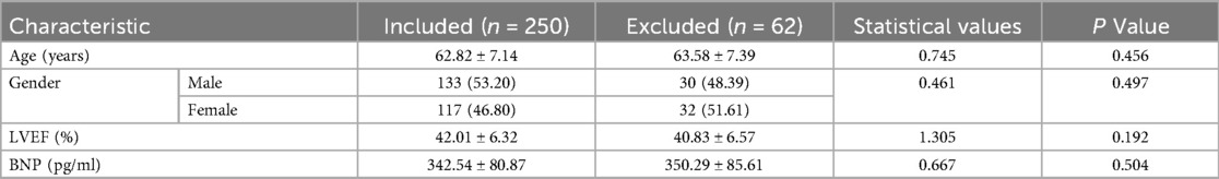 Initially, 312 HF patients were screened. After exclusions (n = 62), as shown in Figure 1. 250 were enrolled and randomized into training (n = 175) and verification (n = 75) sets. Baseline characteristics showed no significant differences between included/excluded patients (all P > 0.05) (Table 1), indicating minimal selection bias.