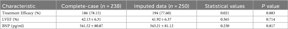To assess the robustness of our findings, we conducted a sensitivity analysis for patients with partially missing data (n = 12). These patients had missing values in ≤10% of baseline or outcome variables. Using multiple imputation (MI) with chained equations (MICE) in R software, we generated five imputed datasets. The analysis revealed no significant differences in key outcomes (treatment efficacy, LVEF, BNP levels) between the imputed and complete-case datasets (all P > 0.05), as shown in Table 2. This suggests that the missing data were unlikely to bias our primary conclusions.