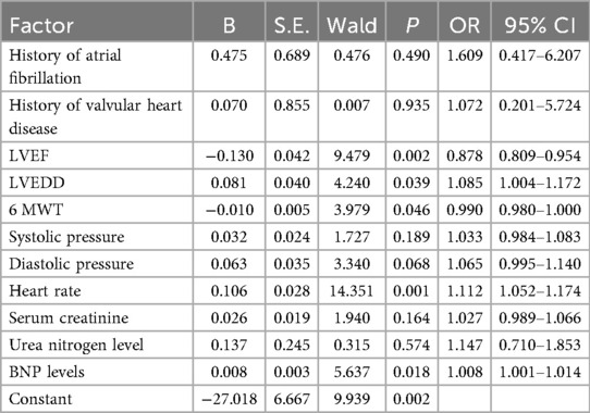 In the training set, the results of univariate analysis showed that the history of atrial fibrillation, valvular heart disease, LVEF, LVEDD, 6 MWT, systolic blood pressure, diastolic blood pressure, heart rate, blood creatinine, urea nitrogen level, and BNP level between the treatment ineffective group (n = 40) and the effective group (n = 135) had statistical differences (P < 0.05). as shown in Table 4.