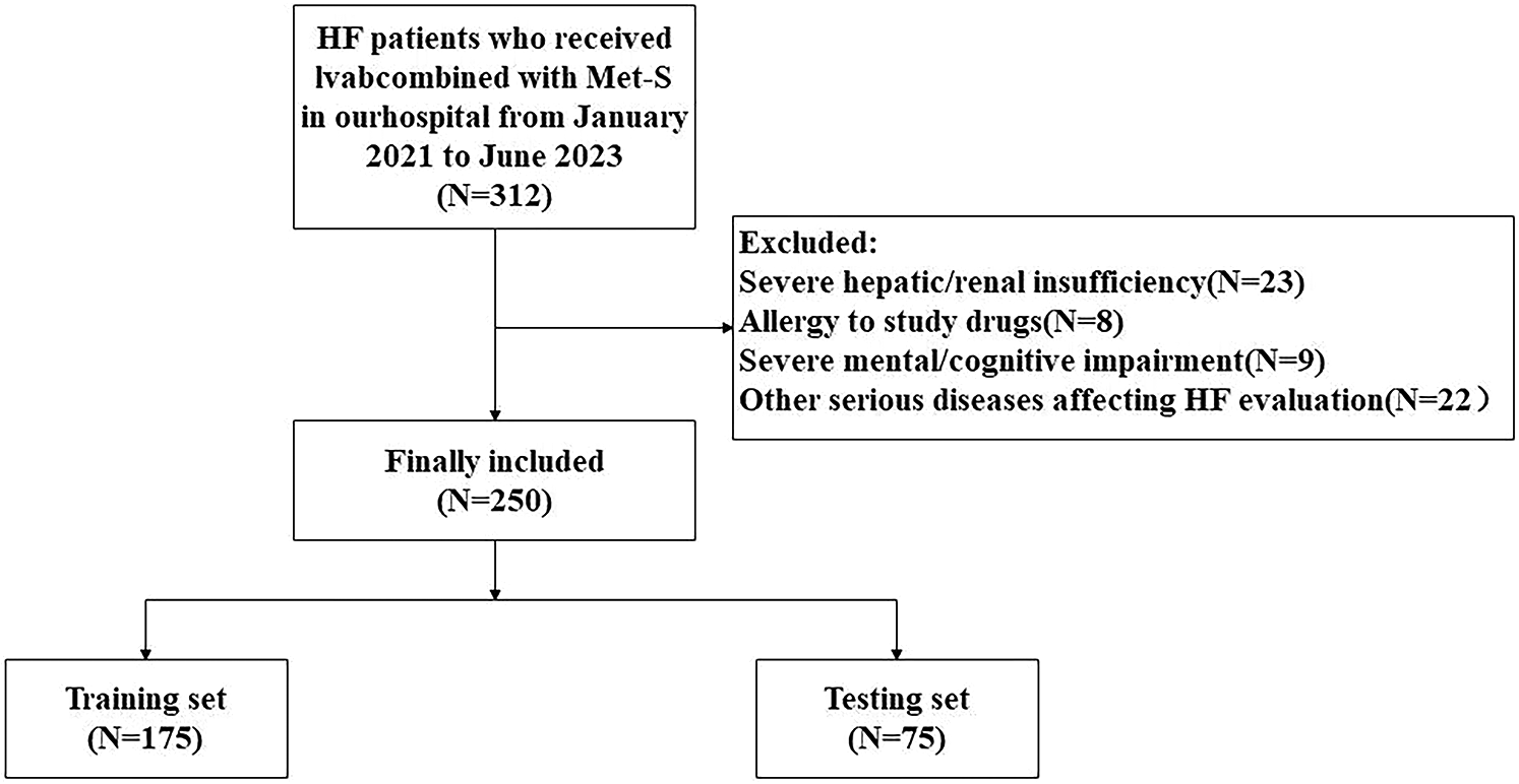 With the approval of our Ethics Committee, we retrospectively analyzed data from HF patients who received Ivab combined with Met-S in our hospital from January 2021 to June 2023. Finally, 250 cases were included and randomly divided into a training set and a testing set according to the ratio of 7:3. The requirement for informed consent was waived by the Ethics Committee due to the retrospective nature of the study. Inclusion criteria: (1) Compliant with diagnostic criteria for HFrEF (LVEF ≤40%) per 2022 AHA/ACC/HFSA Guidelines (15); (2) Age ≥18 years; (3) Treatment with Ivabradine + Metoprolol Succinate for the specified duration; (4) Complete clinical data (baseline characteristics, follow-up records, and outcome assessments). Exclusion criteria: (1) Severe hepatic/renal insufficiency; (2) Allergy to study drugs; (3) Severe mental/cognitive impairment; (4) Other serious diseases affecting HF evaluation (e.g., advanced malignancies).