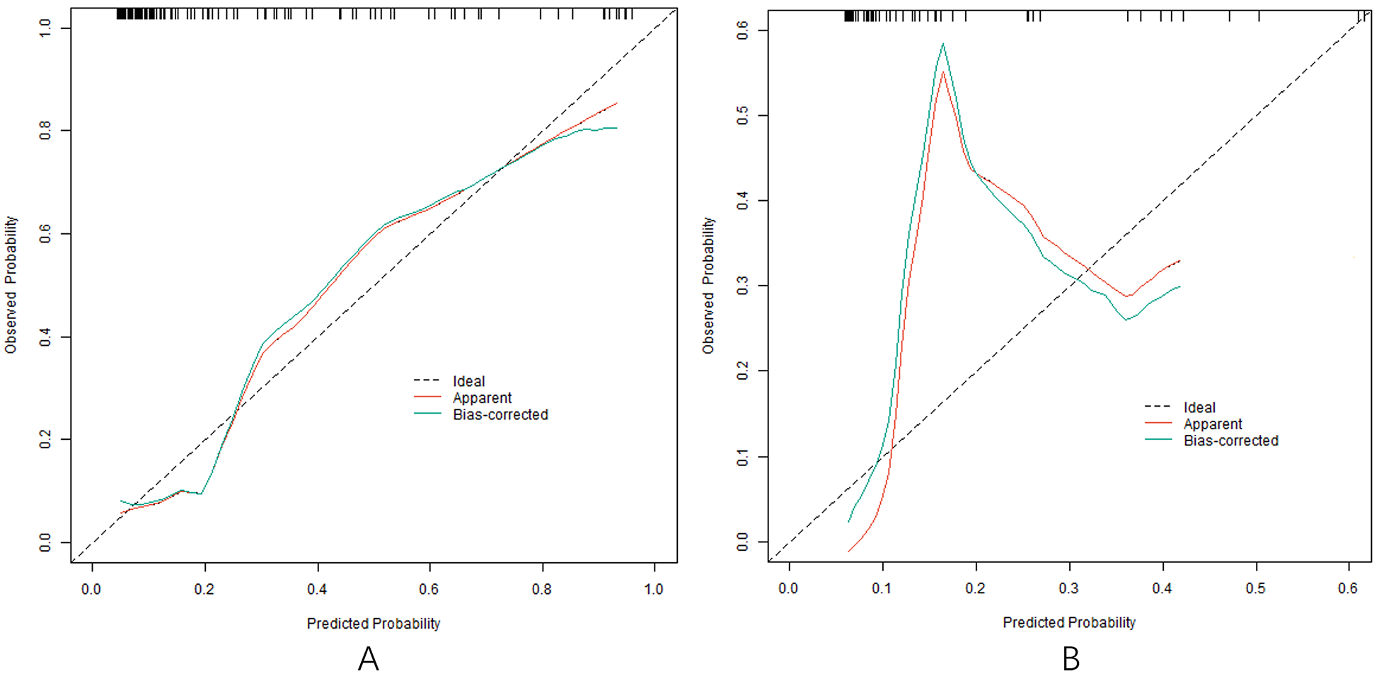 Calibration curve in the training set (A) and the testing set (B).