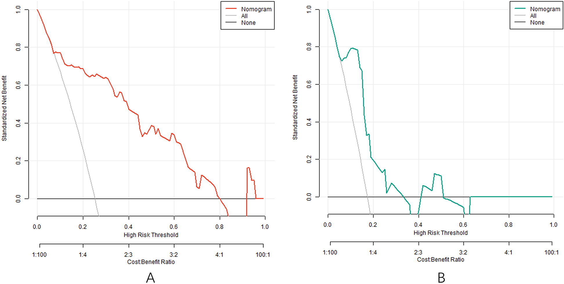 Decision curve in the training set (A) and the testing set (B).