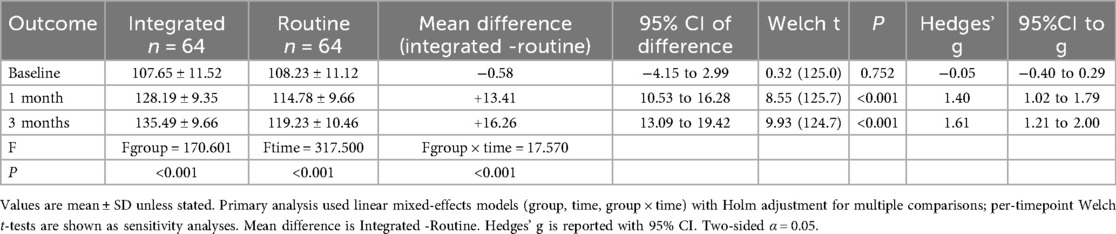 For each continuous outcome, we fit a linear mixed-effects model (LMM) with group (observation vs. control), time (baseline, 1-month, 3-month), and the group × time interaction as fixed effects, and a subject-level random intercept to account for within-patient correlation. We report estimated marginal means (EMMs) at each time point, the between-group difference-in-change (ΔΔ = Δ_observation−Δ_control) with 95% confidence intervals (CIs), and standardized effect sizes (Hedges’ g). Model assumptions (residual normality and homoscedasticity) were checked; two-sided P values are presented and Holm adjustment was applied within prespecified outcome families.When baseline imbalance was present (SMD > 0.10 or P < 0.20), we prespecified inclusion of age, sex, LVEF, and NYHA class as covariates. Parameters were estimated by REML, and degrees of freedom were computed using the Satterthwaite approximation. Skewed biochemical variables (e.g., triglycerides)were log-transformed for modeling and back-transformed for presentation when appropriate. The primary endpoint was the change in SAQ-overall from baseline to 3 months. Secondary endpoints included HPLP-II, CADE-Q SV, echocardiographic measures (e.g., LVEF, LVFS), and physiological/biochemical markers (SBP, DBP, BMI, triglycerides, LDL). For each endpoint we present EMMs, within-group change (Δ), and ΔΔ with 95% CIs; multiplicity was controlled by Holm correction within families (patient-reported outcomes; echocardiography; physiological/biochemical markers). The single primary endpoint was not additionally adjusted for multiplicity. The significance level was α = 0.05 (two-sided).Sensitivity analyses comprised: (1) per-timepoint between-group contrasts using Welch's t-tests with Hedges’ g; (2) within-group paired t-tests for pre-to-post changes; and (3) a complete-case analysis alongside the primary LMM. Missing data were assumed missing at random (MAR), under which LMMs provide valid inference; for endpoints with >10% missingness, we additionally performed multiple imputation by chained equations (m = 20) and re-fit the primary models. We also report the minimal detectable effect (MDE) for the primary endpoint at α = 0.05% and 80% power, based on the observed variance–covariance structure. All analyses were performed in IBM SPSS Statistics 27.0 and R 4.3.1 (packages: lme4, lmerTest, emmeans, multcomp), adhering to STROBE and TIDieR reporting guidance.
