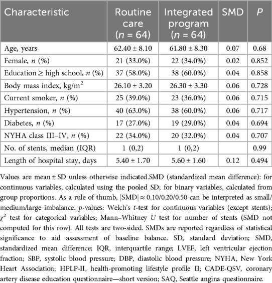 This was a single-center, retrospective, non-randomized cohort conducted at a tertiary cardiovascular hospital in Henan, China. During routine service rollout, an integrated nurse–physician management program for post-PCI care was introduced as a clinical service (not a trial). Patients who received the integrated program constituted the observation group, whereas contemporaneous patients managed under routine care formed the comparison group. Exposure (integrated vs. routine) was identified retrospectively from service logs and electronic health records (EHRs); no protocolized randomization occurred. Participants and allocation: Adults (≥18 years) with coronary heart disease treated with PCI were eligible if they were clinically stable at discharge, could complete questionnaires, and had baseline plus ≥1 follow-up assessment (1 or 3 months). We excluded patients with hemodynamic instability; severe cognitive/psychiatric disorders precluding valid self-report; end-stage renal/hepatic failure; or a scheduled staged PCI within 3 months. Diagnosis and eligibility were determined according to the most recent international standards, specifically the 2025 ACC/AHA/ACEP/NAEMSP/SCAI Guideline for Acute Coronary Syndromes (10).Allocation reflected care-as-received (non-random). To address selection bias, we provide a comprehensive baseline characteristics table reporting standardized mean differences (SMDs) alongside p-values, and we prespecified length of hospital stay (LOS) as a contextual covariate given its potential association with recovery and service uptake.Usual care vs. integrated program (definitions):Routine care comprised ward-based discharge education, medication reconciliation with written instructions, and cardiology visits at approximately 1 month and 3 months, with ad hoc telephone checks per unit policy. The integrated program added structured risk-factor counseling, symptom monitoring and medication-titration support, and team-based education via clinic contacts and WeChat messaging on a predefined schedule. Full TIDieR details (who/what/where/when/how much/tailoring/fidelity) are provided in the Intervention subsection. Sampling frame and timeframe. We retrospectively identified 128 post-PCI patients admitted December 2023–January 2024: integrated/observation n = 64 and routine/control n = 64. All records were reviewed using standardized retrospective procedures. Follow-up timing (for consistency with reviewers):Follow-up windows were predefined as 28–35 days (1 month) and 84–98 days (3 months) to align with post-PCI clinic schedules and early rehabilitation milestones.