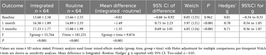 The study also enriches the empirical evidence on the role of integrated nurse–physician models in cardiovascular recovery. Recent nursing-focused studies have shown that nurse-led continuity of care and behavioral interventions significantly enhance post-PCI quality of life (14, 15). Moreover, structured WeChat-based interventions have been found to enhance medication adherence and disease knowledge in cardiac populations (16). Consistent with these findings, our results support the broader application of team-based, digitally augmented secondary-prevention strategies. Future research should extend follow-up to 6 or even 12 months to evaluate the durability of these benefits and incorporate cost-effectiveness analyses to inform policy implementation. cAlthough PCI can relieve vascular stenosis and restore blood flow, it does not eradicate the underlying atherosclerotic pathology. Studies report a 1-year recurrence rate of 20% to 60% post-PCI (17), making secondary prevention crucial. Our findings confirm that integrating nursing and medical specialties can more effectively foster health-promoting lifestyles in post-PCI patients. The traditional model of care is characterized by physician leadership with nurses in a supporting role, whereas integrated medical–nursing care is a multidisciplinary approach that leverages the strengths of different professionals and has demonstrated favorable effects in nursing education, clinical care, and research in recent years (18, 19). In this framework, our study shows that combining medical and nursing expertise helps foster the adoption of health-promoting lifestyles among patients with coronary artery disease after PCI. Behavioral improvements observed at 1 and 3 months corroborate this effect. The development of health behaviors entails awareness building, creating a supportive environment, motivating change, and sustaining action—processes that require joint effort by clinicians and patients over time. During the intervention, healthcare professionals jointly assessed individual needs, resources, and self-management capacity; activated patients’ engagement in behavior change; helped them abandon unhealthy habits while cultivating an enabling environment; provided health education to enhance disease knowledge and behavioral intent, thereby improving adherence; and used follow-up monitoring with timely feedback to facilitate the establishment and maintenance of healthy behaviors (20–23). Although integrated care programs have been disseminated across various disease populations, research specifically targeting lifestyle reconstruction in post-PCI patients remains limited. Our study demonstrated beneficial effects in this population. Future work should further capitalize on collaborative strengths and optimize intervention content and follow-up cadence to more comprehensively promote health behavior formation.In addition, we found that CADE-QSV scores increased in both groups at 1 and 3 months, with greater gains in the integrated-care group, suggesting that this model helps improve disease knowledge (the CADE-QSV instrument has sound reliability and validity). As the intervention progressed, the rate of knowledge gain slowed, indicating the need for longer follow-up to more fully delineate the trajectory of change. Meanwhile, SAQ scores improved at 1 and 3 months in both groups, with larger increases in the integrated-care group; echocardiographic parameters also shifted in favorable directions. Overall, these findings are consistent with prior evidence on improvements in quality of life and cardiac function (24, 25). Taken together, the results further support the integrated-care plus digital follow-up pathway as a clinically valuable strategy for post-PCI rehabilitation management. Though our findings are promising, several limitations must be acknowledged. The non-randomized, single-center observational design means residual confounding cannot be excluded. While adjustments were made for age, sex, LVEF, and NYHA class, time-varying covariates such as medication adherence, education level, or stent number were not modeled, which may bias results in either direction. Use of self-reported measures may introduce recall and social desirability biases. Although multiplicity adjustment was performed within outcome families, broader inferential control remains limited. Shared clinical pathways may pose contamination risks between groups, and generalizability is constrained by our specific tertiary hospital and cultural context in China. These issues underscore the need for prospective, multicenter studies with standardized adherence tracking and blinding strategies.