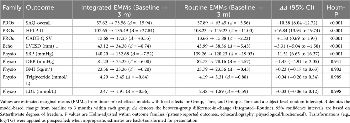 This table reports estimated marginal means (EMMs) at each time point, within-group change (Δ = 3-month−baseline), and the between-group difference-in-change (ΔΔ = Δ-observation−Δ_control) with 95% confidence intervals (CI) and Holm-adjusted P values (Holm-P). Each continuous outcome was modeled with an LMM including fixed effects for group (observation vs. control), time (baseline, 1-month, 3-month), and their interaction, and a subject-level random intercept; parameters were estimated by REML with Satterthwaite degrees of freedom. When baseline imbalance was present (SMD > 0.10 or P < 0.20), age, sex, LVEF, and NYHA class were prespecified covariates. Skewed biochemical variables (e.g., triglycerides) were log-transformed in modeling and, when appropriate, back-transformed for presentation. Multiplicity was controlled by Holm correction within prespecified families: (i) patient-reported outcomes (SAQ-overall, HPLP-II, CADE-Q SV); (ii) echocardiography (e.g., LVEF, LVFS, LVESD); (iii) physiological/biochemical markers (SBP, DBP, BMI, TG, LDL). The primary endpoint (3-month ΔΔ in SAQ-overall) is a single hypothesis and was not additionally adjusted; all tests are two-sided with α = 0.05. Directionality: ΔΔ is defined as Observation−Control; for outcomes where higher is better (SAQ-overall, HPLP-II, CADE-Q SV), ΔΔ > 0 favors the observation group, whereas for outcomes where lower is better (e.g., LVESD), ΔΔ < 0 favors the observation group. Sample size: n = 64 per group Table 7; Figure 8.