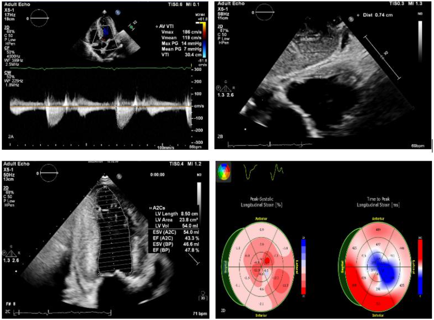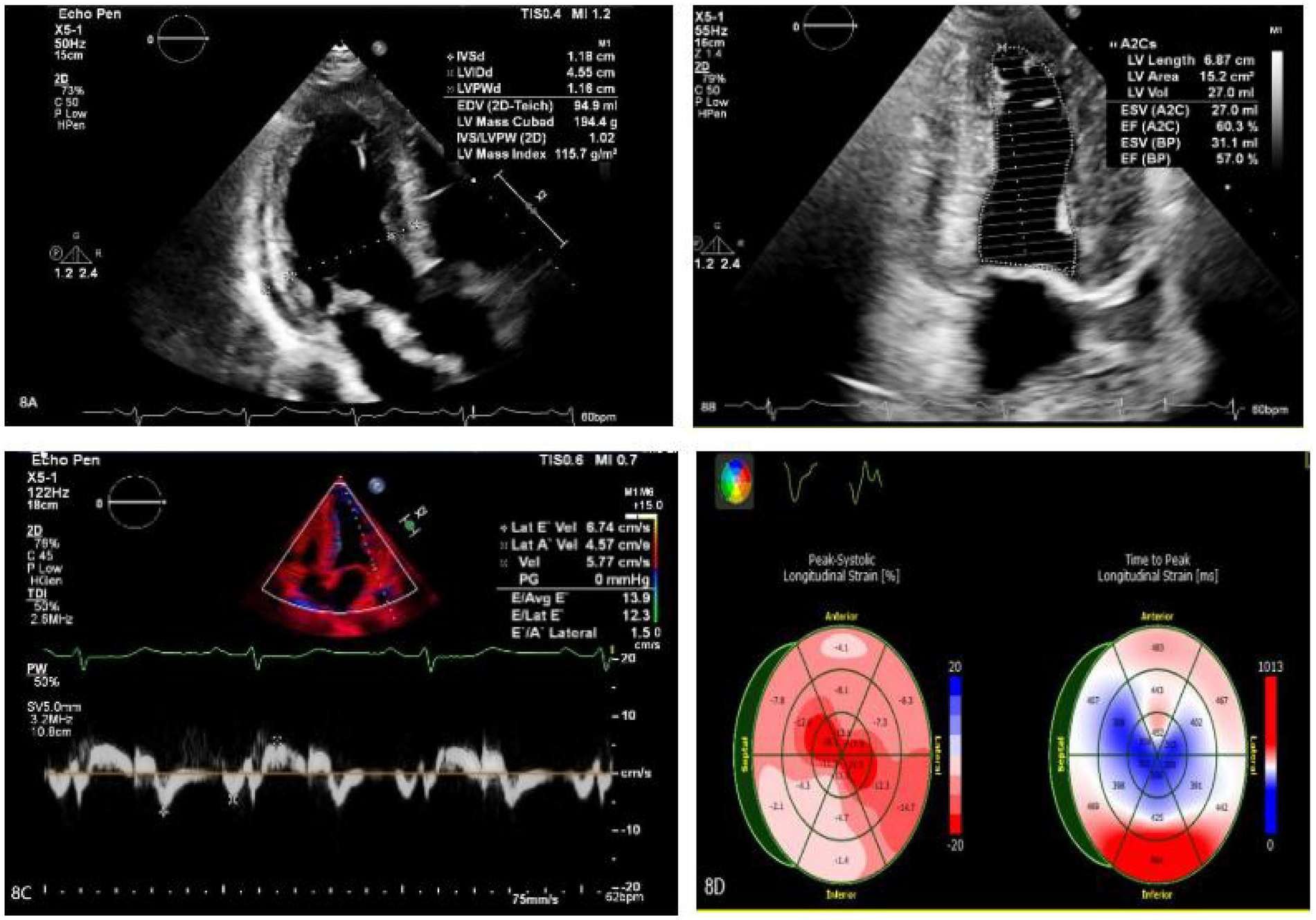 (A–C) The ventricular myocardium appears thinner compared to previous measurements: left ventricular posterior wall thickness (LVPWd): 1.16 cm; right ventricular free wall thickness: 0.45 cm. Left ventricular systolic function is normal (EF: 57%), with mildly reduced left ventricular diastolic function (Grade 1). (D) The left ventricular global longitudinal strain (LV GLS) is −10.4%. Apical strain is preserved, while basal and mid-segment strains are reduced.
