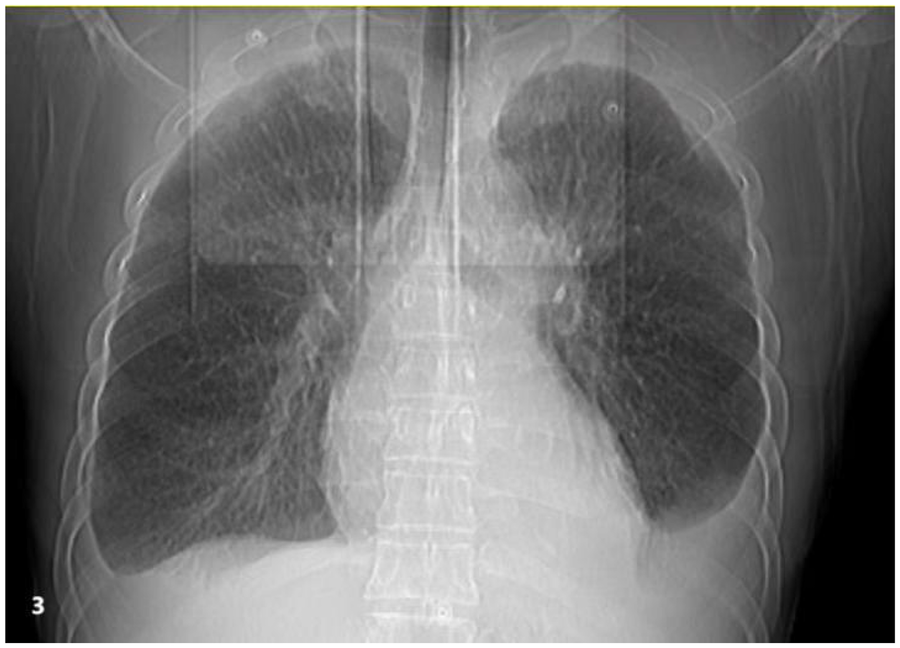 Chest imaging reveals bilateral moderate pleural effusions with atelectasis of the adjacent lung tissue caused by the pleural effusion.