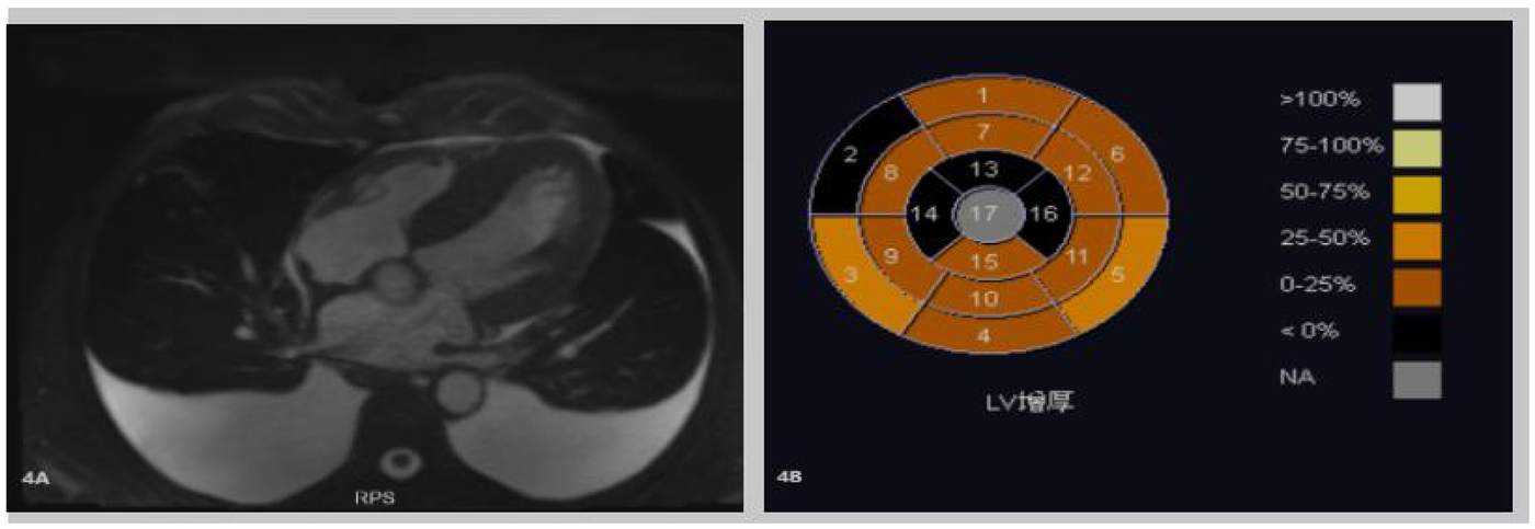 Cardiac enhanced MRI (Figure 4) demonstrated thickening of the left ventricular myocardium with abnormal perfusion and enhancement changes in the right ventricular myocardium, indicative of myocardial amyloidosis. A small amount of pericardial effusion was also noted, along with slight regurgitation of the mitral and tricuspid valves during systole.