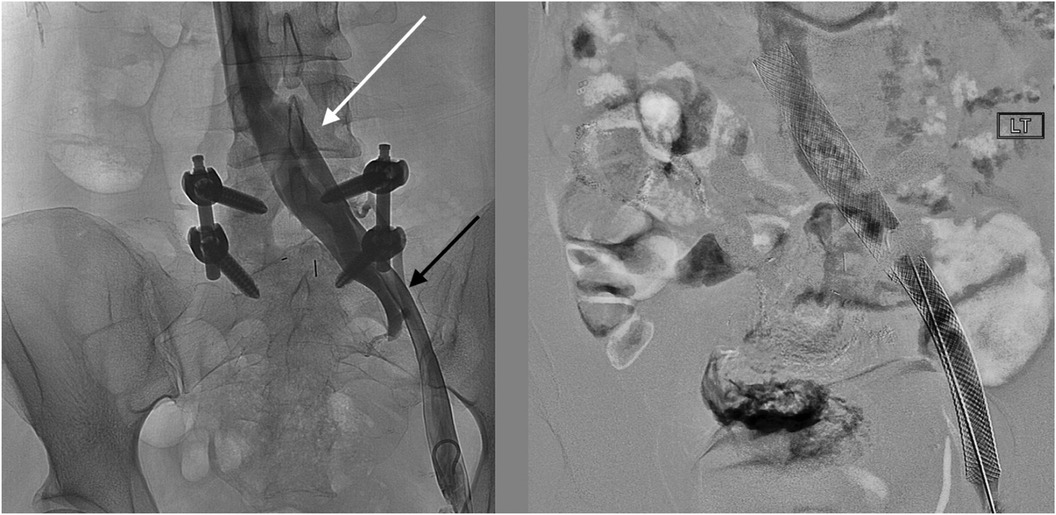 Figure 2. Venographic images at the time of procedure from a left common femoral vein access show (left) an en-face widening of the central left common iliac vein (white arrow) and the stenotic left external iliac vein (black arrow). After stenting (right), the affected areas are covered by the self-expanding stents.