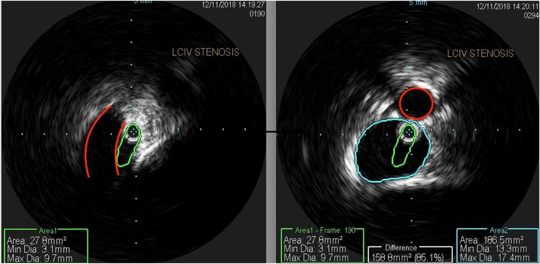 Figure 3. An intravascular ultrasound shows (left) a profile of a compressed left common iliac vein (green) by an overlying right common iliac artery (red). The right-sided image shows a composite of the normal portion of the left common iliac vein (blue) and a compressed central left common iliac vein (green), representing 85% area stenosis. The right common iliac artery is outlined in red.