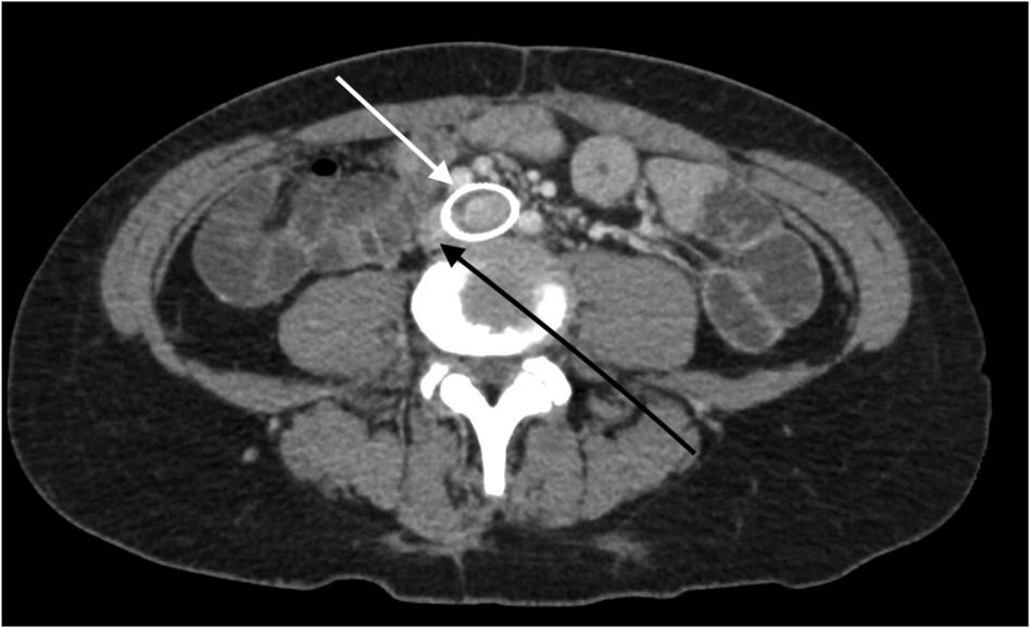 Figure 4. A CT venogram in the axial plane shows a stented left common iliac vein (white arrow) and the adjacent compressed right common iliac vein (black arrow).